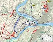 Da Jacksons tre kolonner nærmede sig Harpers Ferry insisterede oberst Dixon S. Miles, som havde kommandoen over garnisonen på at beholde hovedparten af tropperne i nærheden af byen i stedet for at indtage stillinger på de omkringliggende højdedrag, hvorfra de kunne dominere området. De sydcarolinske tropper under brigadegeneral Joseph B. Kershaw stødte kun på beskeden modstand ved Maryland Heights, som var det vigtigste punkt i forsvaret. Et kraftigt angreb fra Kershaws og William Barksdales brigader den 13. september fordrev de mest erfarne unionstropper fra højdedragene.[34]