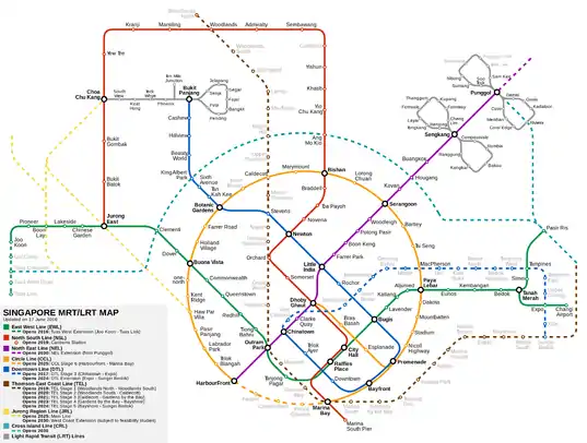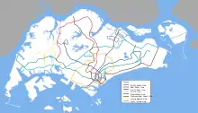 Kort over Singapores metro i år 2030, hvis alt går efter planen. North South Line er med rød, East West Line er med grøn, North East Line er med lilla, Circle Line er med orange, Downtown Line er med blå, Thomson Line er med brun, Eastern Region Line med lyserød, Jurong Region Line med gul, Cross Island Line er med turkis og alle LRT-linjer er med grå.