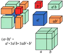 Algebra er en vigtig matematisk disciplin, som mange skoleelever i en eller anden form stifter bekendtskab med, i Danmark typisk i løbet af gymnasiet, i USA i high school. Undervisningen i algebra bygger videre på elevernes kendskab til aritmetik, men hvor aritmetik drejer sig om at behandle bestemte tal,[53] arbejder man i algebra med tal med ukendt, konstant eller skiftende størrelse.[54] Ved hjælp af disse algebraiske størrelser, samt en særlig algebraisk notation og de aritmetiske regneregler, er det muligt at beskrive forholdet mellem forskellige talstørrelser på formel og præcis måde, og dermed angive almene løsninger for en lang række beregningsopgaver. Inden for såvel naturvidenskab i almindelighed som matematik i særdeleshed findes der mange kvantitative sammenhænge, såsom andengradsligningen (se figur), som er beskrevet ved hjælp af algebraiske ligninger. Undersøgelsen af metoder til at løse ligninger fører til studiet af abstrakt algebra. Det for fysikerne vigtige begreb vektorer, der er generaliseret til vektorrummet og studeret i lineær algebra, tilhører de to grene algebra og rum.