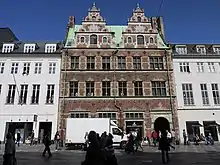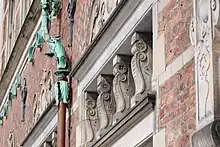 - Der er dog en kendelig forskel, idet hovederne på gården på Amagertorv var anbragt på slutstenen i buerne, og i svagt relief, medens hovederne på Vallø Slot, Børsen, Rosenborg Slot osv. er fremspringende og findes midt i de flade, trekantede felter i frontispicerne over vinduerne.