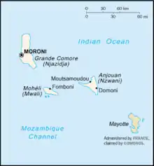 ![]() Kort over Comorerne; Mayotte er til højre. | ||||||||||||||||||||||||||||||||||||||