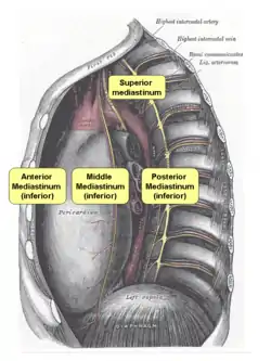 Mediastinum som helhed er begrænset fortil af brystbenet og bagtil af rygsøjlen, og så til begge side af lungernes pleura. Hjertet er heri den største struktur, og mediastinums indellinger navngives ud fra deres position relativt til hjertet.