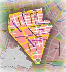Mehringplatz domineres af en brønd med en fredssøjle, opført i 1843 midt på pladsen. Under 2. verdenskrig blev pladsen totalt ødelagt, men er siden genopbygget. I dag er der et karakteristisk boligbyggeri på pladsen. Pladsen rummer desuden installationen Pfad der Visionäre, der blev indviet i 2006 – tre rækker med kvadrater, der hver er en kvm. store, og som rummer citater af betydningsfulde europæere; Danmark repræsenteres af Karen Blixen. Et udvalg har valgt citaterne i samarbejde med landenes ambassader. Siden maj 2008 har kvadraterne været oplyst nedefra.