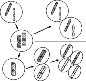 Ved meiose I adskilles homologe kromosomer, og man får to haploide celler med replikerede kromosomer. Ved meiose II adskilles søsterkromatiderne, således at der nu er fire haploide celler med ureplikerede kromosomer.