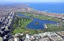 CBD og de omgivende bydele indeholder mange vigtige historiske bygninger som Royal Exhibition Building, Melbourne Town Hall og Parliament House.[96][97] Selvom CBD kaldes centrum, er det langt fra det demografiske centrum. Da forstæderne især strækker sig mod sydøst, er det geografiske centrum Glen Iris.[98]