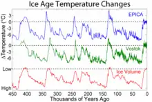 Kurver der viser udviklingen i temeratur og mængden af is gennem de seneste istider