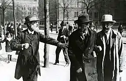 ![]() Lederne af mensjevik partiet fotograferet på Norra Bantorget i Stockholm i Sverige i forbindelse med et overnationalt socialdemokratisk møde i maj 1917. Pavel Axelrod, Julius Martov og Alexander Martinov | |
