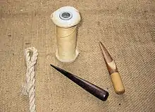 Merlespiger, splejsenål og reb med færdigsplejset øje