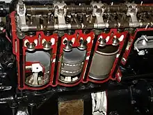 - Tolv cylindre bestående af foringer af stål med højt kulstofindhold, placeret i to individuelt støbte cylinderblokke af aluminium, med separate topstykker. 'Våde' foringer, dvs. kølevæsken er i direkte kontakt med foringerne. Topstykkerne har ventilstyr af støbejern på indsugningsventilerne, af fosforbronze på udstødningsventilerne, og udskiftelige "Silchrome" ventilsæder af en stållegering. To modsat stillede tændrør stikker ind i hvert forbrændingskammer.