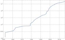 Udviklingen siden 1950 i antallet af cifre i det størst kendte mersenne-primtal