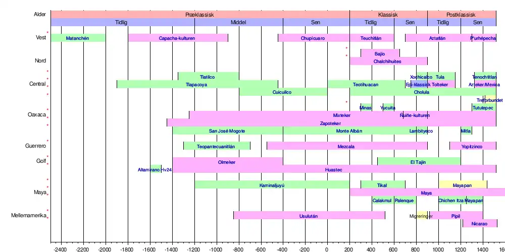 | Postklassisk | 900-1519 e.v.t. | Azteker, tarascaner, mixteker, totonaker, pipil, itza, ko'woj, k'iche', kaqchikel, poqomam, mam |