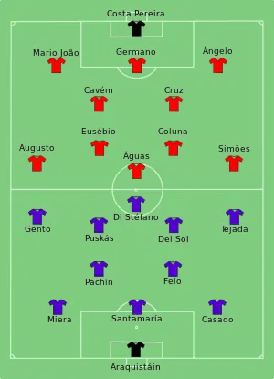 Kampen blev en livlig forestilling med i alt otte mål. Da dommer Leo Horn fløjtede af efter 1. halvleg, stod der 3-2 til Real Madrid. Den ungarske stjernespiller Ferenc Puskás havde fra det 18. til. 39. minut scoret et hattrick. José Águas og Domiciano Cavém havde scoret målene for Benfica.