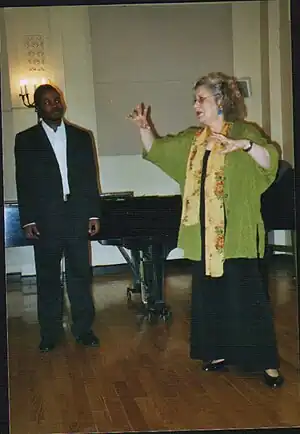 Mira Zakai israelsk altsanger og professor i sang ved et mesterkursus i New York. Hun instruerer deltageren i en position.
