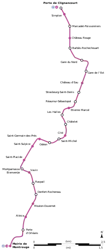 Metrolinje 4 går mellem Porte de Clignancourt og Porte d'Orléans. Linjen blev taget i brug i 1908 og er i dag 10,5 km lang.