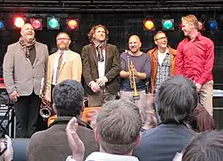 ![]() Mezzoforte, Frankfurt am Main, 2012. Fra venstre: Jóhann Ásmundsson, Oskar Gudjonsson, Eyþór Gunnarsson, Sebastian Studnitzky, Bruno Müller og Gulli Briem | |
