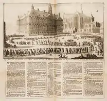 Den 18. marts 1678 fandt statsbegravelsen sted, og en lang begravelsesprocession gik gennem byen. Forrest de fire officerer der kom efter de Ruyter i rang, efterfulgt af to kompagnier soldater fra byværnet, ti vægtere, fire trompetister, kommandant Boot med det store admiralsflag med de Ruyters våben. Herefter fulgte sørgehesten og kisten båret på skift af 36 bærere. Omkring bærerne gik seksten skibskaptajner, fire hovedofficerer, admiralløjtnanter og viceadmiraler. Efter kisten fulgte Constantijn Huygens repræsenterende prisen af Oranje, repræsentanter for republikkens admiraliteter og sønnen Engel de Ruyter samt andre familiemedlemmer. Efter familien kom repræsentanter fra Spanien og Danmark, medlemmer af "Staten van Holland en West-Friesland" (parlamentsmedlemmer), konsuler fra Spanien, Genova og mange andre.
