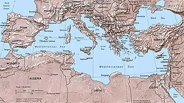 - "Mediterranean Sea". Encyclopedia Britannica. Hentet 2015-10-23.