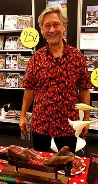 ![]() Mik Schack serverer vindtørret dansk vildsvinefilet for læserne på BogForum 2008 | |