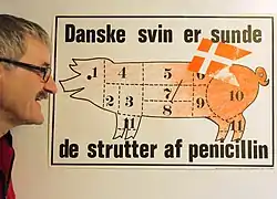 ![]() Mikael Witte og Den oprindelige svineplakat, november 2013 | |