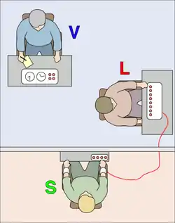 I eksperimentet deltog 3 personer: En forsøgsleder, en "lærer" og en "elev". Før forsøget startede blev der trukket lod om hvem der skulle være lærer, og hvem der skulle være elev. Lodtrækningen var imidlertid "fikset" således at forsøgspersonen altid blev lærer (det var to papirlapper som blev trukket, og på begge stod der lærer). Eleven var i virkeligheden en skuespiller. Forsøget blev ledet af en streng, "upåvirket" forsøgsleder iklædt tekniker-uniform. Læreren og eleven blev i det oprindelige forsøg anbragt i to forskellige rum med lydforbindelse imellem. Til eleven var der tilsyneladende fæstnet et sæt elektriske ledninger som læreren kunne kontrollere fra et panel. Læreren fik derefter udleveret en liste med to-stavelsesord som han skulle lære eleven. Efter at have læst en serie ord højt, skulle læreren læse første stavelse i ordet og eleven skulle fortsætte med den næste stavelse.[1] Eleven fik fire alternative svar, og han skulle markere det korrekte svar ved at trykke på en knap der repræsenterede dette alternativ. Hvis eleven svarede forkert, skulle læreren tildele ham et elektrisk stød. I virkeligheden fik eleven ikke stød, men for at forsøgspersonen skulle tro at situationen var reel, fik han selv først et stød af laveste grad (45 volt) før forsøget begyndte. På panelet foran kunne læreren tilsyneladende ændre stødstyrken fra 45 til 450 volt. De øverste stødtrin var mærket "FARE – meget alvorlig stød!". "Læreren" fik besked på at give stød med højere styrke for hvert forkert svar som eleven gav. "Læreren" kunne under hele forsøget høre elevens "lidelser" når stødet blev givet. Hvis "læreren" tøvede med at gives stød under eksperimentet, opfordrede forsøgslederen verbalt til at han fortsatte i følgende rækkefølge:[1]