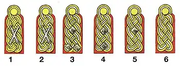 | General | Generalløjtnant | Generalmajor | Brigadegeneral | Oberst | Oberstløjtnant | Major | Kaptajn | Premierløjtnant | Løjtnant | Sekondløjtnant | ||||||||||||||||||||||||||