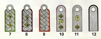 | Admiral | Viceadmiral | Kontreadmiral | Flotilleadmiral | Kommandør | Kommandørkaptajn | Orlogskaptajn | Kaptajnløjtnant | Premierløjtnant | Løjtnant | |||||||||||||||||||||||||||