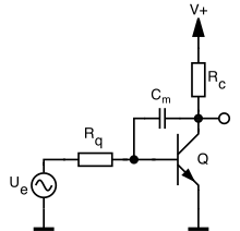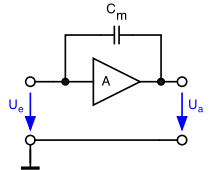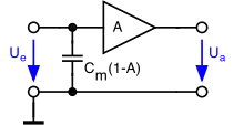 hvor er forstærkningen af forstærkeren – og Cm er tilbagekoblings kapacitansen.