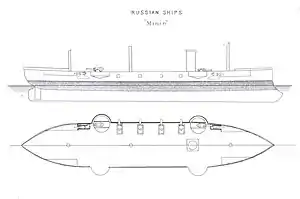 Den russiske panserkrydser Minin blev påbegyndt midt i 1860'erne som søsterskib til panserskibet Kniaz Pozharski. Udviklingen af panserskibe gik hurtigt på den tid, og undervejs blev det besluttet at udstyre skibet med kanontårne med det engelske panserskib Captain som forbillede. Da Captain sank i 1870 på grund af sin ustabile konstruktion, ombestemte den russiske marine sig igen, og skønt Minin allerede var søsat, blev konstruktionen ændret og skibet blev færdigbygget som panserkrydser. Derfor gik der 12 år fra køllægningen til skibet blev afleveret. Panserkrydseren var navngivet efter Kuzma Minin, en købmand fra Niznij-Novgorod, der blev en central person i befrielsen af Rusland under den såkaldte "forvirringstid" i begyndelsen af 1600-tallet.