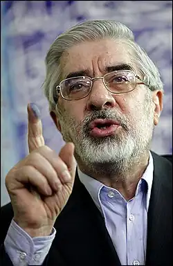 Han var kandidat til Irans præsidentvalg 2009, hvor han blev erklæret slået af den siddende præsident Mahmoud Ahmadinejad. Mousavi selv protesterede over valgresultatet, hvilket han er overbevist om skyldes valgsvindel.[1] Han var også leder for demonstrationerne efter valget [kilde mangler].