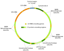Ligesom for prokaryoter er der en stor andel af kodende DNA og ingen gentagelsessekvenser. Mitokondrielle gener transskriberes til multigene transskripter, som kløves og polyadenyleres for at blive til modne transskripter. Mitokondrielt DNA koder kun for ca. 5 % af de proteiner, der er nødvendige for mitokondriets funktion;[68] det er generne i cellekernen, der koder for de fleste, og disse proteiner må transporteres ind i mitokondriet.[13] Det præcise antal gener indkodet i henholdsvis cellekernen og det mitokondrielle DNA varierer med arten. Det mitokondrielle genom er generelt cirkulært, men undtagelser er kendt.[69] Generelt mangler mtDNA introns, hvilket er tilfældet for det humane mitokondrielle genom;[13] der er dog blevet fundet introns i visse eukaryoters mtDNA,[70] f.eks. hos gær[71] og protister,[72] herunder Dictyostelium discoideum.[73]