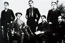 Medlemmer af Ungt Bosnien i 1910. Stående fra venstre: Ukendt, Bogdan Žerajić, ukendt; siddende: Jovo Princip (Gavrilos storebror), Gavrilo Princip og Nikola Princip (Gavrilos lillebror).