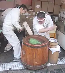 Ved den normale japanske tilberedelse bliver de anvendte klæberis (mochigome) først dampkogt. Traditionelt placeres de derefter i et stort trækar-morterer (臼, usu), hvorpå der slås med store hamre af træ (杵, kine), idet en hjælper vender risklumperne efter hvert slag. Denne traditionelle tilberedelsesmåde anvendes dog nu om stunder stort set kun ved festivaler eller ved offentlige sumokampe. Ved normal tilberedelse bruges maskiner, da det andet kræver stor fysisk kraft.