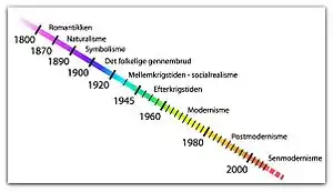 Denne gang var der tale om en kraftig strømning med mange digtere der benyttede alle genrer selv om lyrikken stadig stod i centrum for interessen – sandt nok var modernisterne ret traditionelle, når de udtrykte sig episk og dramatisk. Hovedmændene Klaus Rifbjerg og Villy Sørensen redigerede ca. 1960 tidsskriftet Vindrosen. Omkring tidsskriftet grupperede sig en række lyrikere: Benny Andersen, Jørgen Gustava Brandt, Ivan Malinovski, Bundgård Povlsen, Jørgen Sonne og Jess Ørnsbo, prosaisterne var færre: Peter Seeberg og den sent opdagede Albert Dam.
