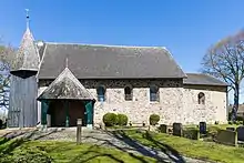 Kirken er opført i 1100-tallet af kampesten[1]. Den var i begyndelsen et kapel uden præst og menighed. Fra opførelsestiden er der bevaret flere indvielseskors. Trætårnet i kirkens vestlige ende blev første gang nævnt 1586. Våbenhuset ved sydportalen er fra 1892. Det flade bjælkeloft i kirkens indre blev senere skiftet ud med sengotiske hvælvinger. Af interiøret kan nævnes den enkle romanske granitdøbefont. Altertavlen fra 1682 viser Jesu korsfæstelse på Golgata. Prædikestolen er lidt yngre. Kirkens barokkorgel er fra 1746, det er placeret ved korbuen.