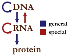 Det centrale dogme i molekylærbiologien beskriver retningen hvormed genetisk information i naturen overføres mellem DNA, RNA og protein (se figur 1). For det fleste organismer gælder det at flowet af genetisk information sker fra DNA via RNA til protein (blå pile i figur 1). I visse vira ses dog et flow af af genetisk information fra f.eks. RNA til DNA (rød pil i figur 1). Man har i naturen endnu ikke observeret et flow af genetisk information fra protein til protein, fra protein til RNA eller fra protein til DNA. Et sådan flow af information ville betyde at sekvenserne af aminosyrer i et protein i princippet kunne betragtes som genetisk information, der ville kunne videregives mellem generationer. Sådan forholder det sig altså ikke.