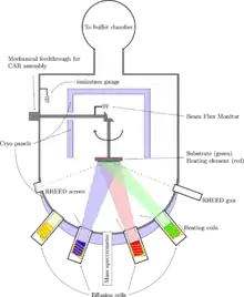 En simpel tegning der viser de centrale komponenter og overordnet layout og koncept for hovedkammeret i et MBE-system