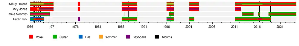 - Micky Dolenz – forsanger og baggrundsvokal, rytmeguitar, trommer, percussion (1966–1971, 1976, 1986–1989, 1996–1997, 2001–2002, 2011–present)