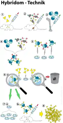 Monoklonale antistoffer kan fremstilles ved hjælp af hybridomteknologi. Hybridomcellen stammer fra to andre celler, der er fusioneret, nemlig en myelomcelle og en lymfocyt. Myelomcellen deler sig relativt hurtigt, da det er en kræftcelle og formerer sig ukontrolleret. Lymfocytten er en hvid blodcelle, der producerer antistoffer, men den deler sig langsomt, hvilket gør den svær at dyrke. Disse to celler udgør tilsammen en perfekt kombination til produktion af antistoffer, når der dannes en hybrid af dem.