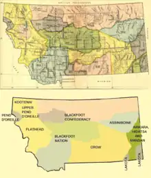 Der er syv indianerreservater i Montana: Blackfeet Reservation (blackfoot), Crow Reservation (crow), Flathead Reservation (flathead og kutenai), Fort Belknap Reservation (gros ventre og assiniboine), Fort Peck Reservation (assiniboine og sioux) og Northern Cheyenne Reservation (northern cheyenne).[10] Rocky Boy's Reservation (chippewa cree) blev dannet som det sidste i 1916.[11]