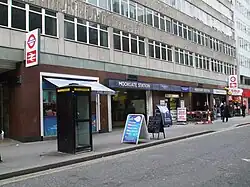 Indgang på Moorgate, hovedbygningens østlige side. Der er endnu en udgang på Moorgate, direkte overfor.