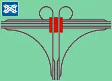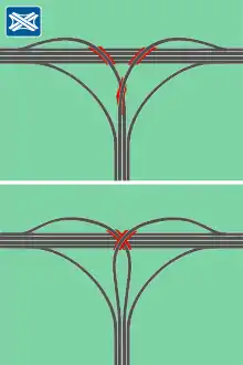 ![]() Malteserkryds til T-kryds. Øverst med tre broer. Nederst med to broer ovenpå hinanden |