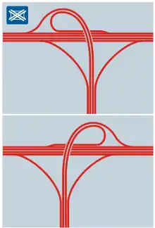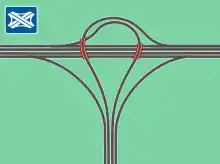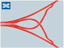 Når en motorvej mødes med en anden, og samles i en fortsættende motorvej, er der ikke behov for forbindelse mellem de to motorveje, men der skal være forbindelse for trafikken fra den fortsættende motorveje til de to forgreninger. Fx: Trekantsområdet