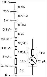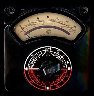 - Ved spændingsmåling kan ved hjælp af en omskifter indsættes forskellige formodstande, således at man kan få fuldt udslag ved varierende spændinger. Disse modstande vil typisk være valgte således, at spændingsområdere vokser med 10 dB, hvorved skalaerne typisk danner rækker som 1 – 3 – 10 – 30 – 100 – 300 Volt. Rækker der følger 1 – 2 – 5 er også set.