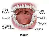 Munden består af to områder: vestibulen og mundhulen. Vestibulen er området mellem tænderne, læberne og kinderne.[2] Mundhulens front og sider er afgrænset af tandbuerne på over- og underkæbebenet, som indeholder tænderne, mens bagsiden er afgrænset af isthmus faucium (overgangen mellem mundhulen og svælget). Ved fronten af mundhulens loft sidder den hårde gane, og bagerst, den bløde. Bagerst, ved den bløde gane, hænger drøblen. Mundbunden er formet af de mylohyoidea muskler, hvorved tungen befinder sig. Tungens sider og underside er dækket af en slimhinde, der når helt frem og også dækker tandkødet. Kæbespytkirtlen og tungespytkirtlen tildeler slimhinden sekret.