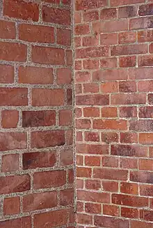 Detalje fra Roskilde Domkirke. Munkesten (tv.) normalstørrelse mursten (th.)