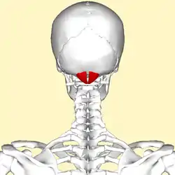 ![]() Rectus capitis posterior minor's lokation i nakken, musklen markeret med rødt. | |