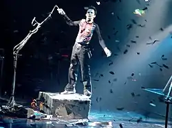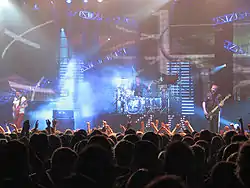 ![]() Muse på International Center, Canada, den 1. august 2007. Fra venstre mod højre: Matt Bellamy, Dominic Howard, og Chris Wolstenholme | |