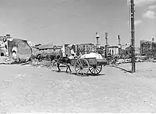 ![]() Befolkningen vender tilbage til den ødelagte by efter den tyske erobring i 1941.  |