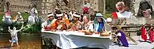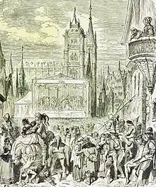 Mysteriespil, Flandern, 1500-tallet. Bemærk korsene på scenen.