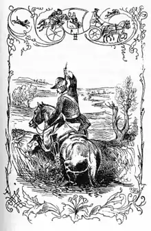 Illustration til Baron von Münchhausens fortælling om, hvorledes han trak sig selv op ved håret.